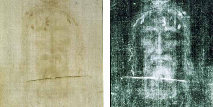 [Above: "The actual image on the Shroud (left) - Photo negative of that image (right)": Photo of Jesus.com. That is, the photo on the right is a negative which is photographically positive, developed from the Shroud image on the left, proving that the actual image on the Shroud is a photographic negative!]