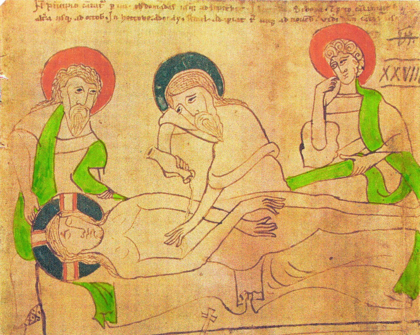The Entombment of Christ (above) and Three Marys at the tomb (below). This third illuminated pen and ink drawing in the Pray Codex is reproduced in Plate III of Ilona Berkovits' book, "Illuminated Manuscripts in Hungary, XI-XVI Centuries," 1969. The "Entombment of Christ" upper scene is evidently that in John 19:38-42 (ESV):