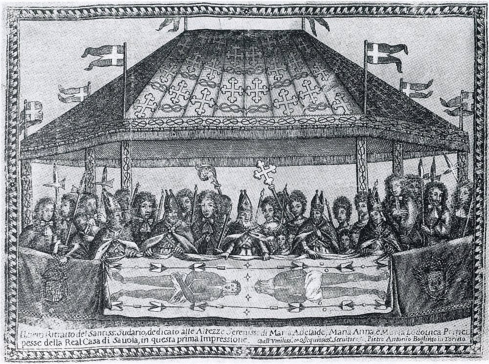 [Above (enlarge): Etching on silk, c. 1690, by Pietro Antonio Boglietto[6] depicting five bishops holding the Shroud at its abovementioned 1684 public exposition.]