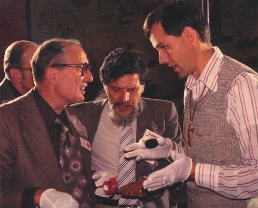 [Right (enlarge): Luigi Gonella (C) in 1978 receiving an official complaint by STURP's John Jackson (R) about Max Frei's (L) attempt to press his pollen collecting sticky tape onto the face of the Man on the Shroud[2]. See Prof. Harry Gove's objection below on "Jackson ... wearing a rather large wooden cross around his neck" in this photo.]