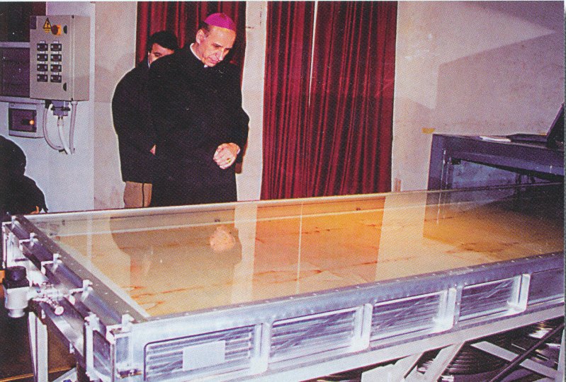 [Left (enlarge): The Shroud in its new container being prayed over by the then Archbishop of Turin, Severino Poletto (1933-)[11].]