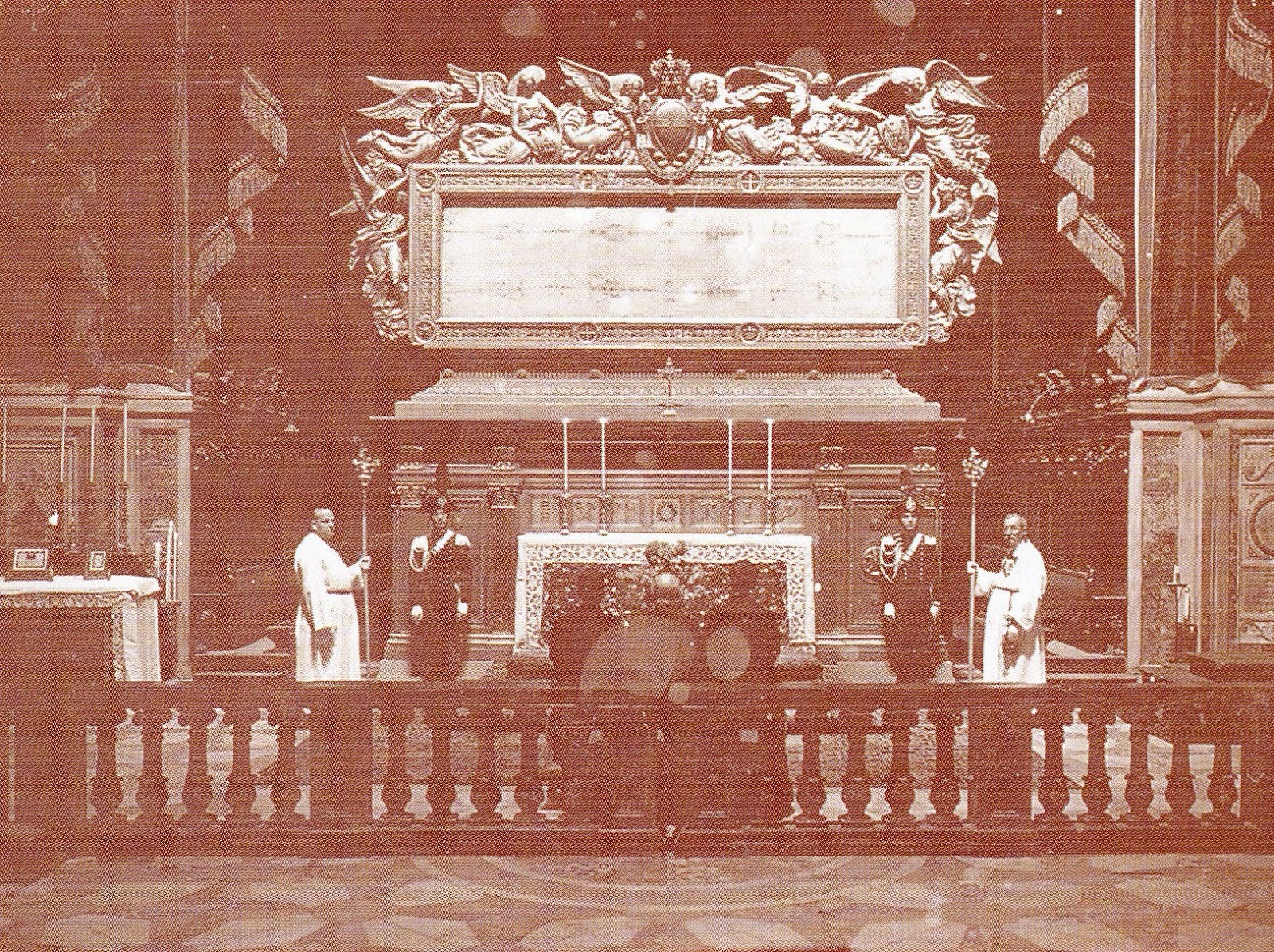 [Above (enlarge): The Shroud again displayed above Turin Cathedral's high altar at the 1933 exposition[4].]