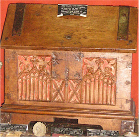 "13th century coffer in which was preserved at Ray Castle the Shroud of Christ brought by Otho de Ray from Constantinople. 1206"[52]However, the style of the carving is late 14th century, although the bottom of the chest may be original[53]. The inner dimensions of the chest in centimetres are ~37.5 long x 16.5 wide x 25 deep[54]. This would neatly fit the 437 x 111 cms Shroud[55], if it were folded twelve times long and eight times wide, i.e. 437/12 = 36.4 cms x 111/8 cms = 13.9 cms[56]. This twelve by eight folds is a simple and economical folding arrangement of the Shroud, and since Othon's family would be unlikely to know the true dimensions of the Shroud if they had never owned it, this ~37.5 cms long x 16.5 cms wide `floor plan' of the bottom of the Ray-sur-Saône chateau chest, which is claimed to have once held the Shroud, is strong evidence that Othon de la Roche really did bring the Shroud with him from Athens (and before that from Constantinople) to his Ray-sur-Saône chateau in Burgundy, France in 1225!