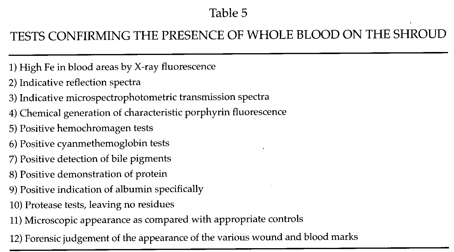 "As for the `blood' [sic] stains, according to John H. Heller's and Alan D. Adler's studies these derived from genuine clotted wounds, and they pass eleven different diagnostic tests, enabling them to be pronounced to be true blood in any court of law. Blood constituents such as proteins, albumen, haem products, and the bile pigment bilirubin (on which Adler is an acknowledged expert) can all be determined to be present. One remarkable feature noted by Adler is that where blood occurs in the same region as body image, the cloth fibres lack body image characteristics below the bloodstain, suggesting that the blood was on the cloth before the body image-making process began[4]. That is hardly the way any artist might be expected to work"[5].]Real blood The bloodstains of the man on the Shroud are real blood[6]. Table 5 below summarizes the tests employed by Adler