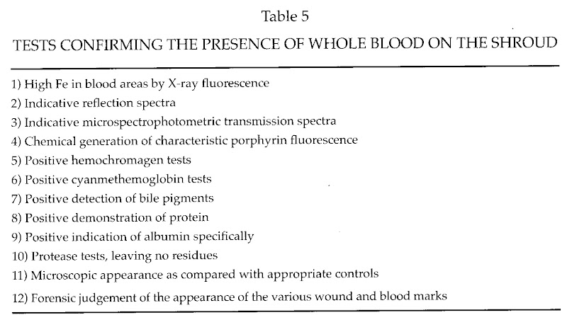 [Above (enlarge)[7]: Table 5: Summary of tests by Adler and Heller which confirmed that the blood on the Shroud was real blood[8]. At the public final meeting of STURP in New London, Connecticut in October 1981, after explaining each item in this table, Adler, who had "already published close to a hundred articles on his blood research; forty-odd concerned porphyrins"[9], concluded: