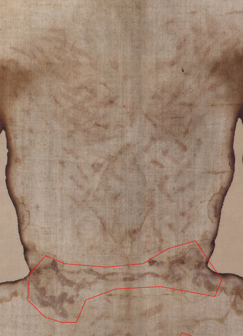 "But when they came to Jesus and saw that he was already dead, they did not break his legs. But one of the soldiers pierced his side with a spear, and at once there came out blood and water."As the above passage implies, it was standard practice for Roman crucifixion squads to break the legs of crucifixion victims with an iron club (called crurifragium)[78], to hasten their death by not being able to push up with their legs to exhale[79]. That the flow of "blood and water" from Jesus' lanced heart was rare (if not unique) is evident in that the Apostle John recorded it and later referred to it in one of his letters (1Jn 5:6). Moreover, Christian apologists of the second and third centuries, a time of frequent public crucifixions which only ended in AD 337 when they were abolished by Emperor Constantine the Great, argued that the flow of blood and water from Jesus' side was a miracle[80]. This argument would only work if their contemporaries were unaware of it having happened in any other crucifixions. That the same rare (if not unique)[81] flow of blood and watery fluid is found on the Shroud[82] is further proof beyond reasonable doubt (given the problems of the forgery theory - see future below) that the Shroud of Turin is the very burial sheet of Jesus[83]!