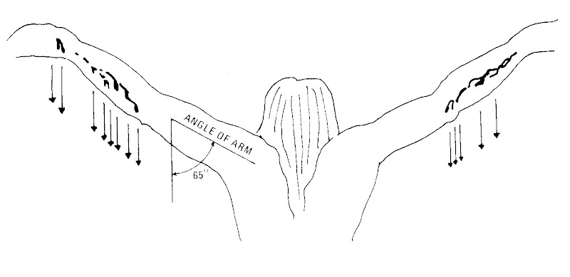 [Above (enlarge): The angle of the arms at crucifixion, deducible from the Shroud by determining the path of the blood flows in following the course of gravity. The main angle appears to have been 65 degrees, but there is evidence that at some stages the forearms were at 55 degrees, indicating that the man of the Shroud sought to raise himself [to breathe-see below]; probably continually, during crucifixion"[62].]