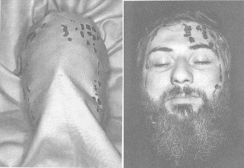 [Below (enlarge): Fig. 4, cutouts of the blood marks above right draped over a man's face (left), and Fig. 5, `blood' marks painted on the man's face through the cutouts[38].]