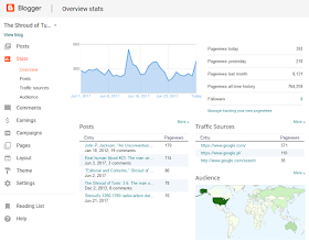 gave this blog's "Pageviews all time history" as 764,259. This compares with 544,771 (up 219,488 or 40.3%) from the same time in June 2016. It also gave the most viewed posts for the month (highest uppermost) as: "`Radiocarbon Dating ... error potential when an item is contaminated with newer material'," Apr 19, 2017 - 209; "X-rays #22: The man on the Shroud: The evidence is overwhelming that the Turin Shroud is Jesus’ burial sheet!," Apr 20, 2017 - 142; "Chronology of the Turin Shroud: Ninth century" Mar 25, 2017 - 141; "Dr Jull's and Prof. Ramsey's prompt, misleading and false replies: Steps in the development of my radiocarbon dating of the Turin Shroud hacker theory #7" - May 10, 2017 - 115; "The Shroud of Turin: 3.6. The man on the Shroud and Jesus were crucified.," Dec 2, 2013 - 113. As can be seen from the graph, pageviews peaked in the middle of the month and then settled down again.