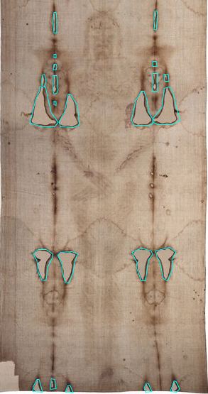 4. Latendresse, M., 2010, "Shroud Scope: Durante 2002: Horizontal: Overlays: Burn Holes (1532 A.D.)" (rotated left 90°), Sindonology.org. [return]