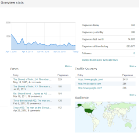compares with 735,259 (up 150,618 or 20.5%) from the same time in April 2017. It also gave the most viewed posts for the month (highest uppermost) as: "The Shroud of Turin: 2.6. The other marks (5): Coins over eyes," May 10, 2013 - 329; "The Shroud of Turin: 3.3. The man on the Shroud and Jesus were scourged," Jul 15, 2013 - 185; "Re: Shroud blood ... types as AB ... aged blood always types as AB, so the significance of this ... is unclear," Mar 18, 2011 - 154; "Three-dimensional #20: The man on the Shroud: The evidence is overwhelming that the Turin Shroud is Jesus' burial sheet!," Feb 5, 2017 - 138; and "X-rays #22: The man on the Shroud: The evidence is overwhelming that the Turin Shroud is Jesus' burial sheet!," Apr 20, 2017 - 112.