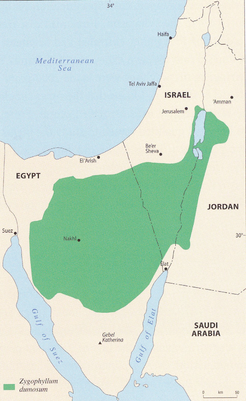 [Above (enlarge): Distribution map of the endemic species Zygophyllum dumosum which is confined to Israel, Sinai and Western Jordan[31].]