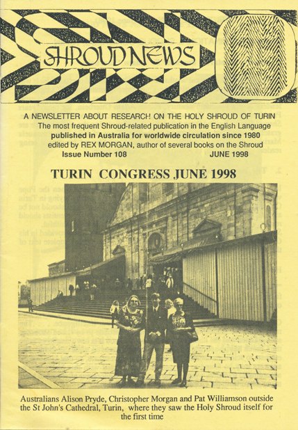 Rex Morgan's Shroud News: My scanning and word-processing of the 118 issues of Rex Morgan's Shroud News, provided by Ian Wilson, and emailing them to Barrie Schwortz, for him to convert to PDFs and add to his online Shroud News archive, continued in August up to issue #108, June 1998 [Right (enlarge).], i.e ~92% completed. Issues in the archive are still up to #100, February 1997.