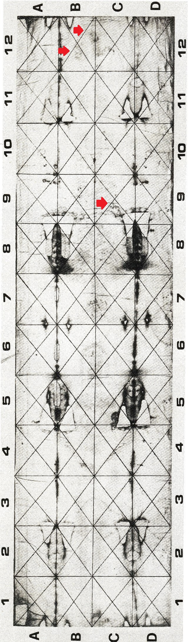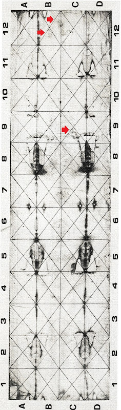 [Right (original with key): Grid map of the Shroud with red arrows pointing to areas B12c (sole of the right foot), B12d (sole of the left foot) and C9d, the "belt of blood" around the small of the Shroudman's back, from where Baima Bollone took his 1973 and 1978 samples[22].]