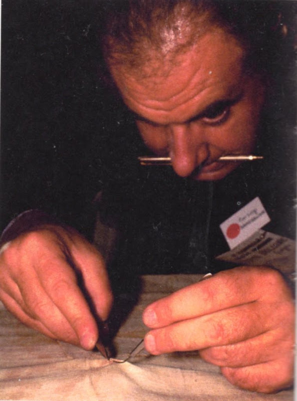 [Left (enlarge)[15]: Prof. Baima-Bollone extracting a bloodstained thread from the Shroud during the 1978 examination.]