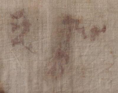 [Above (enlarge)[83]: The dorsal (back) feet bloodstains on the Shroud (flipped vertically for comparison with those of the frontal feet below). The larger stain is a complete imprint from the nail wound in the man's right foot[84]. The square hole made by the Roman nail can be seen slightly below centre above (enlarged)[85]. It is clearer in the Enrie negative below. The smaller stain is an incomplete imprint of the heel