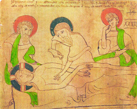 The Entombment of Christ (above) and Three Marys at the tomb (below). This third illuminated pen and ink drawing in the Pray Codex is reproduced in Plate III of Ilona Berkovits' book, "Illuminated Manuscripts in Hungary, XI-XVI Centuries," 1969. The "Entombment of Christ" upper scene is evidently that in John 19:38-42 (ESV):