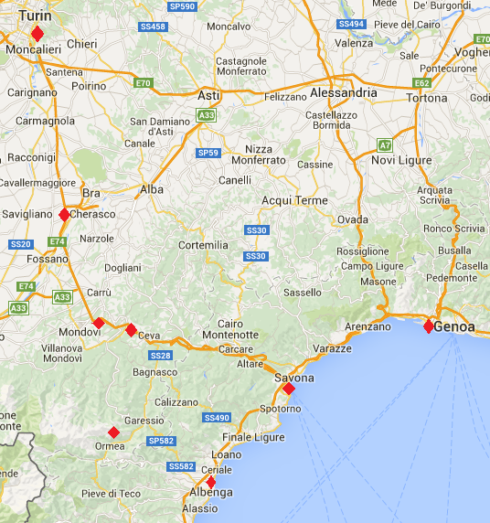 [Above (enlarge): Route (marked by red `diamonds') the Shroud was taken from Turin via Cherasco (16th June), Mondovì (24th), Ceva (25th), Ormea (26th), Caravonica (not shown), to Albenga. From Albenga the Shroud was then sailed via Savona to Genoa arriving on 16th July[2].]