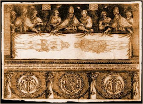 [Above (enlarge): "Ostension of the Holy Shroud" (1579) engraving by Carlo Malliano of the 1578 Exposition of the Shroud in Turin[19]. The radiocarbon dating sample came from the top left hand corner being held by a cleric's "sweaty hands".]