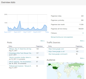 Pageviews: At midnight on 31 August 2017, Google Analytics [Below (enlarge)] gave this blog's "Pageviews all time history" as 788,859. This compares with 584,212 (up 204,647 or 35%) from the same time in August 2016. It also gave the most viewed posts for the month (highest uppermost) as: "Obituary: Rev. H. David Sox (24 April 1936 - 28 August 2016)," - Aug 15, 2017 - 129; "Chronology of the Turin Shroud: Eleventh century," Jul 27, 2017 - 117; "`Atomic resolution studies detect new biologic evidences on the Turin Shroud,' Shroud of Turin News, June 2017," Jul 19, 2017 - 106; "John P. Jackson, `An Unconventional Hypothesis to Explain all Image Characteristics Found on the Shroud Image' (1991)," Aug 13, 2017 - 87 and "Editorial and Contents, Shroud of Turin News, July 2017," Aug 13, 2017 - 85. It is pleasing to see my 2012 post of Jackson's `cloth collapse theory' still being read widely.