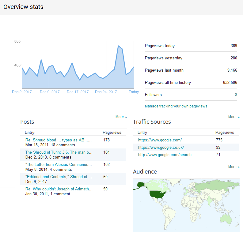Pageviews: At midnight on 31 December 2017, Google Analytics [Below (enlarge)] gave this blog's "Pageviews all time history" as 832,506. This compares with 670,590 (up 161,916 or ~24.1%) from the same time in December 2016. It also gave the most viewed posts for the month (highest uppermost) as: "Re: Shroud blood ... types as AB ... aged blood always types as AB, so the significance of this ... is unclear ," Mar 18, 2011 - 178; "The Shroud of Turin: 3.6. The man on the Shroud and Jesus were crucified.," Dec 2, 2013 - 104; "The Letter from Alexius Comnenus": My response to Dan Porter," May 8, 2014 - 102; "Editorial and Contents," Shroud of Turin News, November 2017," Dec 9, 2017 - 50; and "Re: Why couldn't Joseph of Arimathea have taken the Shroud?" Jan 30, 2011 - 50. Again I cannot explain the continued popularity of some of my older posts.