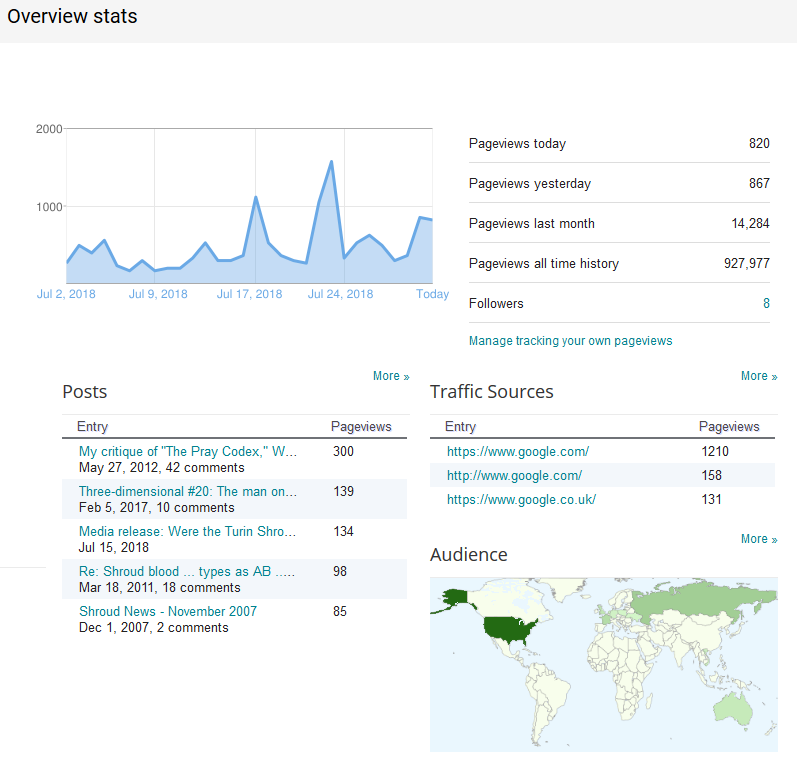 compares with 777,560 (up 150,417 or 19.3%) from the same time in July 2017. It also gave the most viewed posts for the month (highest uppermost) as: "My critique of `The Pray Codex,' Wikipedia, 1 May 2011.," May 27, 2012 - 300; "Three-dimensional #20: The man on the Shroud: The evidence is overwhelming that the Turin Shroud is authentic!," Feb 5, 2017 - 139; "Media release: Were the Turin Shroud radiocarbon dating laboratories duped by a computer hacker?," Jul 15, 2018, 134;"Re: Shroud blood ... types as AB ... aged blood always types as AB, so the significance of this ... is unclear," Mar 18, 2011 - 98 and "Shroud News - November 2007," Dec 1, 2007 - 85.