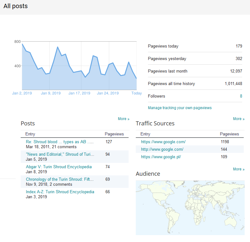 Google Analytics also gave the most viewed posts for the month (highest uppermost) as: "Re: Shroud blood ... types as AB ... aged blood always types as AB, so the significance of this ... is unclear," Mar 18, 2011 - 127; "`News and Editorial,' Shroud of Turin News, December 2018," Jan 5, 2019 - 94; "Abgar V: Turin Shroud Encyclopedia," Jan 8, 2019 - 74; "Chronology of the Turin Shroud: Fifteenth century (2)," Nov 9, 2018 - 69 and "Index A-Z: Turin Shroud Encyclopedia" - Jan 3, 2019 - 66.
