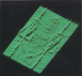 [Above (enlarge): "Three-dimensional reproduction of the Face, which is more akin to the bas-relief than photography. It was a Frenchman, Paul Gastineau, who realized it, by a process of his invention, in April 1974"[12]. See 05Feb17b. Note that Gastineau's photomechanical method of obtaining a 3-D image from a photograph of the Shroud face was two years before and completely different from Jackson and Jumper's 1976 VP-8 Image Analyzer method (see below), yet it produced the same result. Which can only mean that the Shroud man's image really does contain three-dimensional information! Also note the small, round (within the limitations of Gastineau's moving stylus on `wax' process), raised, object over each eye which Gastineau evidently did not notice.]