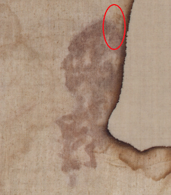 [Above (enlarge)[91]: The frontal right foot bloodstains on the Shroud. The left foot bloodstain is missing entirely because the frontal image `half' of the Shroud is shorter than that of the dorsal image (a mistake that would occur in a real, hurried burial but not one that a forger would make)[92]].