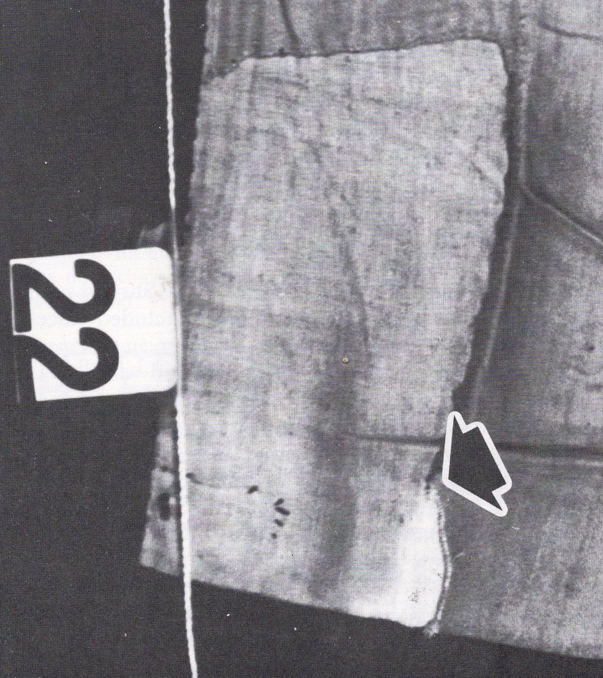 [Left (enlarge): The site of one of the the Raes samples (lighter area of Holland cloth backing pointed to by an arrow) taken from the Shroud's front edge[48]. As we shall see, the 1988 radiocarbon dating sample was taken immediately to the left of where this Raes sample was taken.]