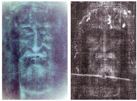 [Above (enlarge): Negative of Sanford's painted Shroud face (left) compared with the Shroud face (right)[WS00, 120-121]. As can be seen, Sanford's negative lacks the photographic realism of the Shroud's.]
