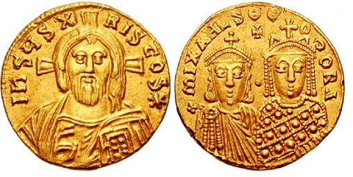 "All this makes all the more intriguing the evidence that someone, sometime after the Mandylion's arrival in Constantinople [in 944], seems to have undone the gold trelliswork covering the cloth, untwined the fringe from the surrounding nails, carefully unfolded the cloth, and, for the first time since the days of the apostles, set eyes on the concealed full-length figure"[WI79, 157-158].842 The second iconoclast period ended with the death of Emperor Theophilos in 842 (see above) and his two year-old son Michael III (r. 842-67) succeeding him[MTW]. During Michael III's minority the Empire was governed by his mother, the Empress Theodora (r. 842-55) [TWW], as his regent[MTW]. Theodora was an iconodule[TIW] and in 843 she reintroduced the minting of coins bearing the face of Christ, with Shroud-like features[PM96, 194; FM15, 116-117]. Also, through