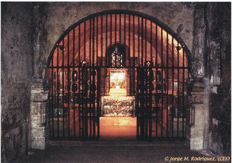 [Right (enlarge[BJ01, pl. 3]): "The Camara Santa, or Holy Chamber, within the chapel built in 812 by King Alfonso II, to hold the Holy Chest (see below) which contained the Sudarium of Oviedo and other relics. The chest can be seen past the metal bars in the centre background.]