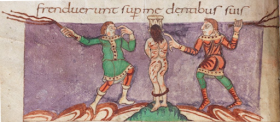 JBS. "Jesus being scourged," Württembergischen Landesbibliothek Stuttgart (Wurttemberg State Library, Stuttgart), Stuttgart Psalter - Cod.bibl.fol.23, 43v.