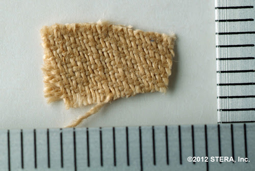 [Left (enlarge): Photomicrograph by Shroudie Barrie Schwortz (1946-2024) in 2012 of Arizona laboratory's remaining undated part of its Shroud sample (presumably "A1" above), as it came cut from the Shroud, with no pretreatment[08Dec14]. As can be seen, it has no obvious contamination or foreign fibres, whereas, if the Shroud were first century (which it is) and subsequent contamination produced the fourteenth century radiocarbon date, then this sample would have to be two thirds shroud and one third contamination (my emphasis)[13Jun14].]